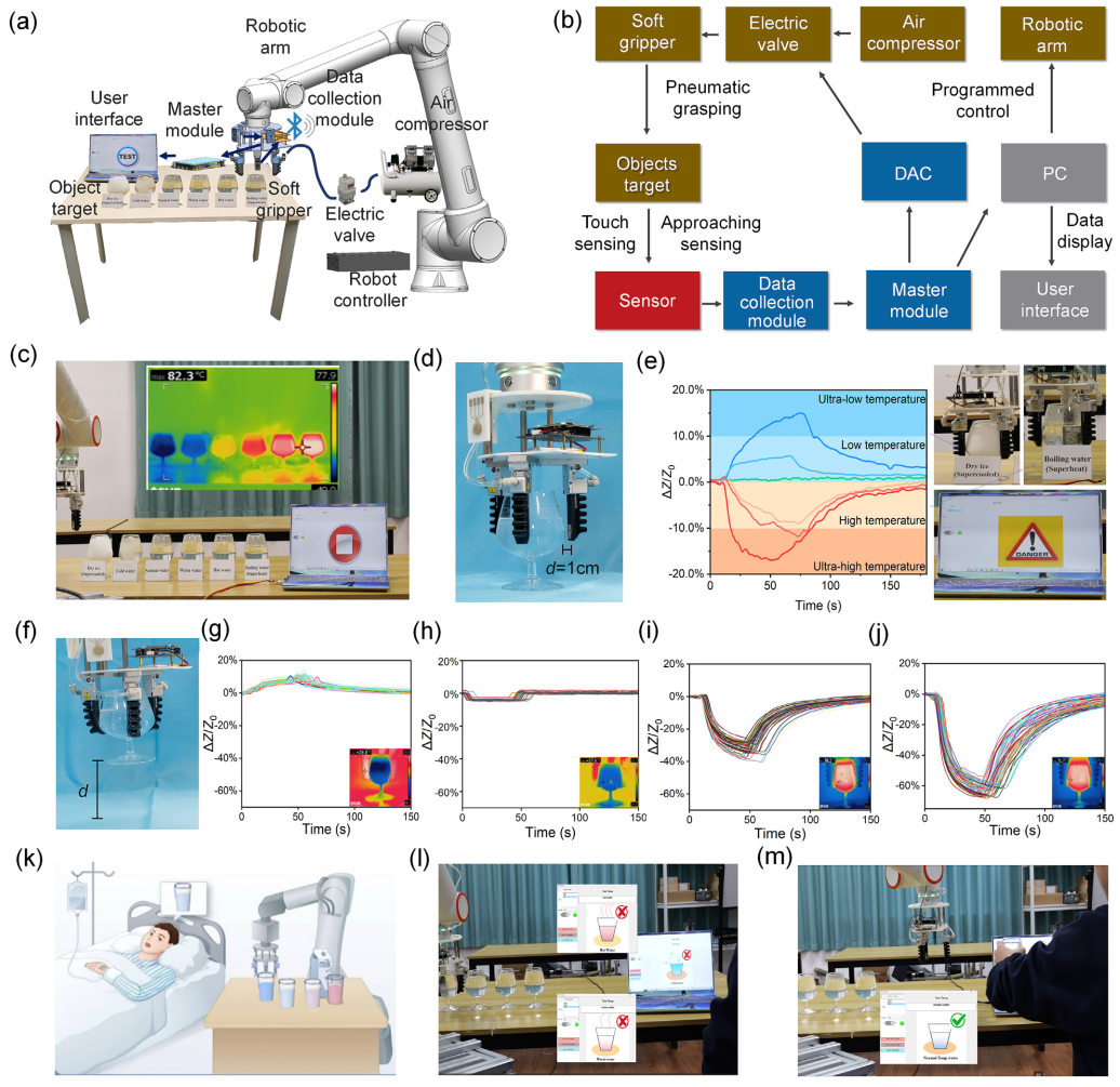 图5. 机器人传感器在热接近感知、热触觉感知和人机交互系统反馈控制中的应用。(a, b) 示意图和框图展示了闭环控制机器人系统的主要组成部分和工作原理,包括传感器数据采集与传输、传感器数据处理与可视化、机器人臂运动的闭环控制以及气动夹具的闭环控制功能。(c) 六个不同温度(−40、0、25、50、75、100 °C)的水杯的光学和红外图像。(d) 照片显示软夹具以最小距离1厘米接近物体进行热接近感知。(e) 在接近六个不同温度水杯时传感器的响应信号。具有特定危险温度的物体(−40 °C在深蓝区域和100 °C在深橙区域)可以被识别,软夹具在后续过程中不会抓取这些危险物体。(f) 照片显示软夹具抓取目标物体。(g–j) 在重复抓取四个安全温度物体(0、25、50和75 °C)50次时的传感器响应信号。(k) 示意图展示机器人系统在床边临床护理中的潜在应用场景。(l, m) 照片显示配备作者传感器的机器人系统,从四个不同温度的水杯中识别并取用适合患者的水(例如,25 °C)。