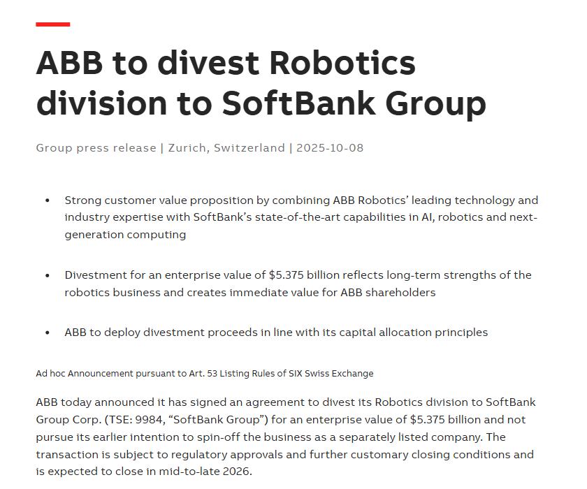 ABB今天(10月8日)宣布已签署协议,将其机器人部门剥离给软银集团公司,企业价值为53.75亿美元,并且不再追求其早期将该业务分拆为单独上市公司的意图。该交易尚待监管机构批准和进一步的惯例成交条件,预计将于2026年中后期完成。