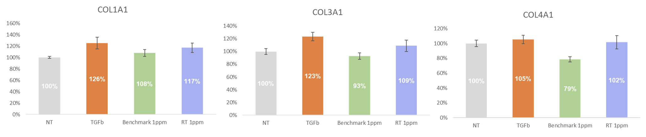 图:功效性对比,在同等浓度(1ppm)下,Retavia™生物视黄醇对比市面竞品视黄醇,在内源性I型胶原蛋白,III型胶原蛋白和IV型胶原蛋白基因的表达上表现更佳