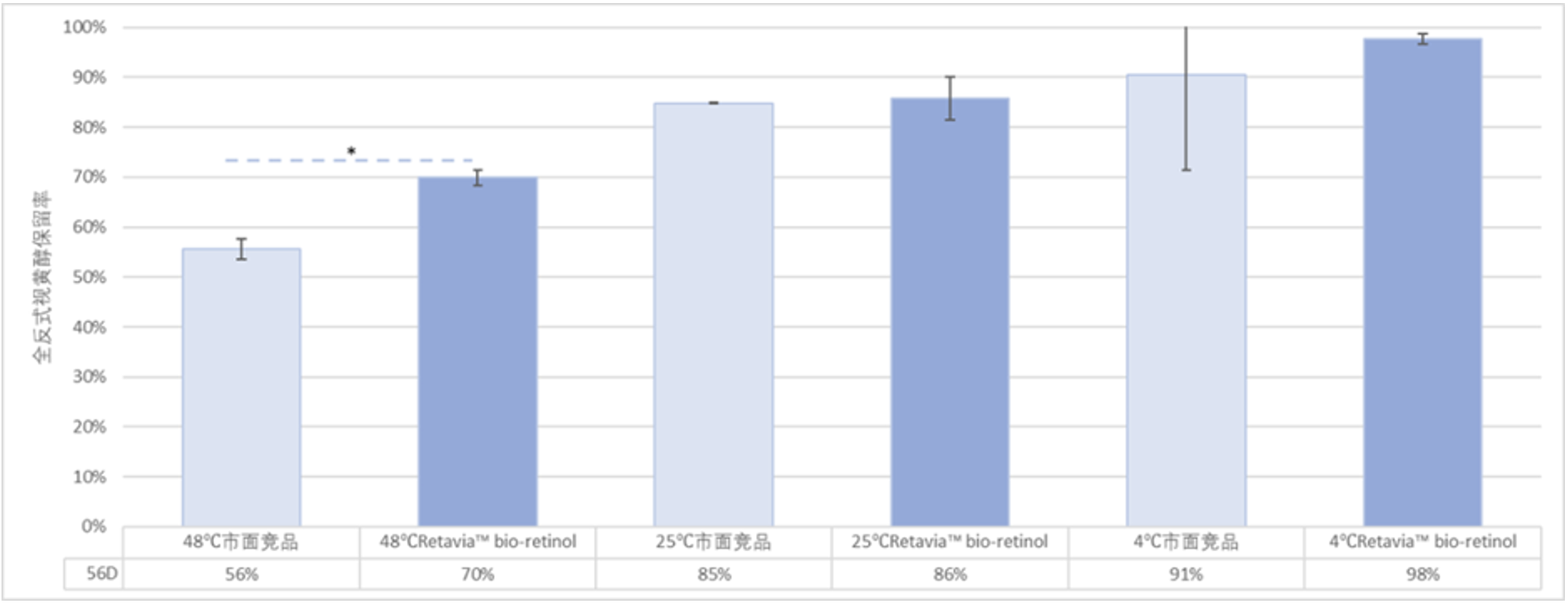 在加速老化实验中,Retavia™ 于 48°C 条件下存放 56 天后,降解率仅为 30%,而主流竞品在相同条件下的降解率高达 44%。在 4°C 冷藏条件下,Retavia™ 降解率低至 2%,而竞品降解率普遍在 9%~11% 之间。优异的稳定性不仅意味着更长的货架期和功效持久性,也显著降低了活性成分在灌装、储存和运输过程中的损耗风险。