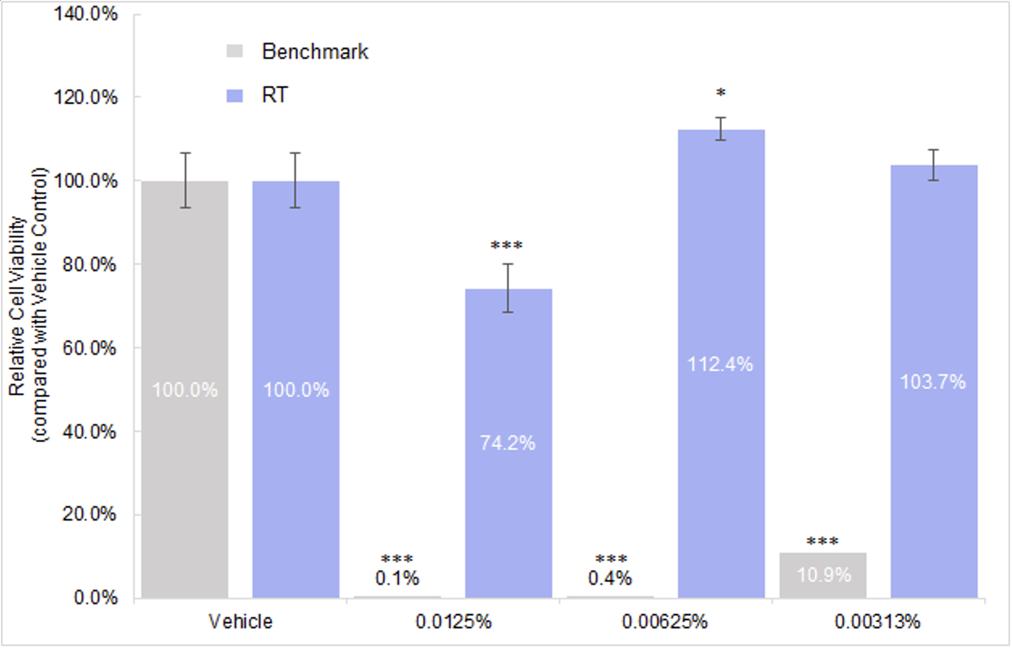 图:温和性测试,Retavia™生物视黄醇在0.006%(60ppm)浓度下,仍能维持高的成纤维细胞活力