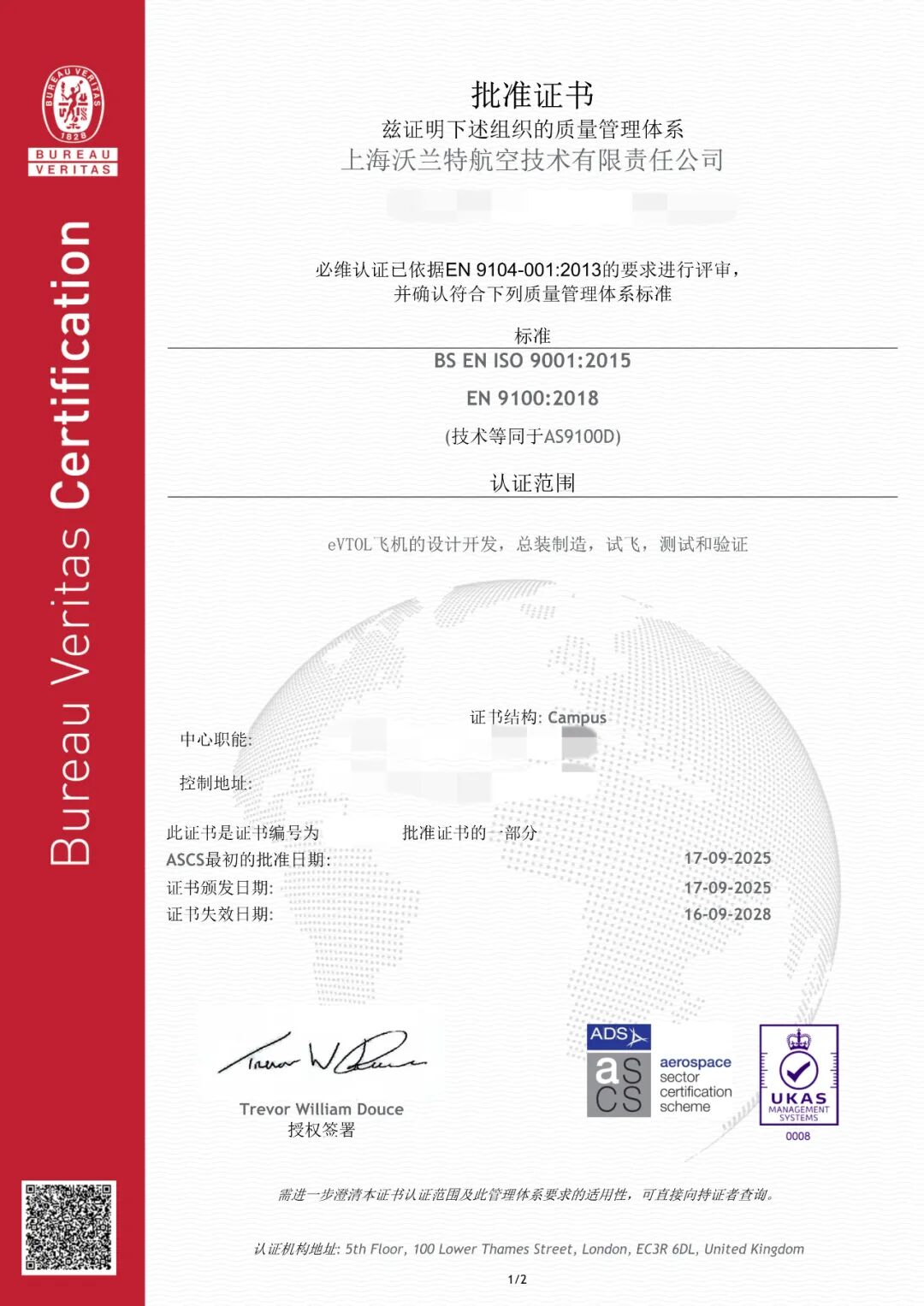 该证书是在ISO9001质量体系要求上开发的航空质量管理体系标准,增加了航空航天行业的特殊要求,旨在确保航空航天产品和服务的高质量和安全性。它要求企业在设计开发阶段就运用专业的分析模式和过程决策工具,进行风险预判,确保 eVTOL 的关键部件达到 “零缺陷” 标准。同时这些过程控制方法还与TC证(型号合格证,Type Certificate)所要求的安全性和可靠性标准相契合,能提升产品在适航审定过程中的信誉和竞争力,普遍业界认可度较高,相当于中国eVTOL企业参与国际竞争的”入场券“,也将增强沃兰特的市场竞争力。