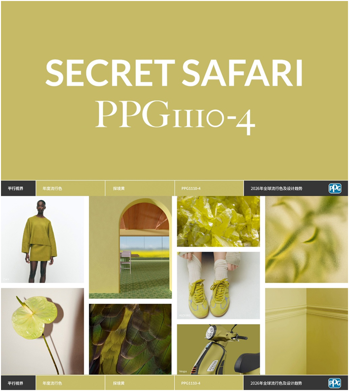 PPG近日正式发布 2026 年度色彩——“探境黄”(Secret Safari,色号PPG1110-4)。这款百搭的黄绿色调,巧妙融合了舒缓宁静与灵动活力,可广泛适配各类应用场景。值得关注的是,该色调隶属于PPG 2026年全球色彩主题 “平行视界”(Parallels),该主题包含三大核心色系:“本真”(Authentic)、“无界”(Visionary)与 “迸发”(Expressive),为不同设计需求提供方向指引。