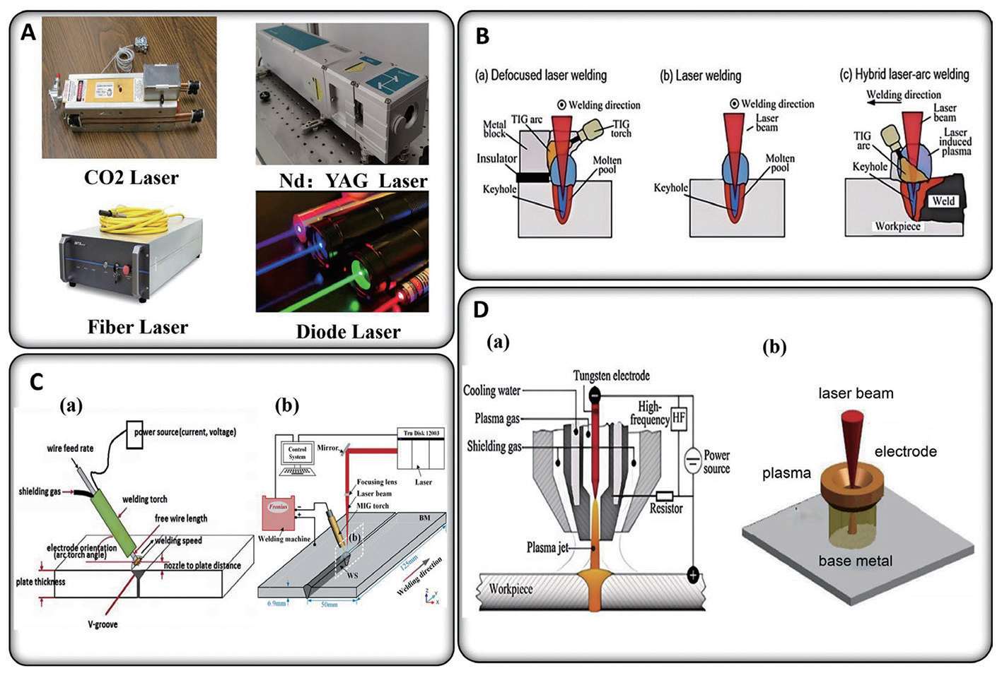 图3:(A)激光器类型:二氧化碳激光器(左上)、Nd:YAG激光器(右上)、光纤激光器(左下)、二极管激光器(右下);(B) (a)离焦激光-钨极氩弧复合焊,(b)传统激光焊,(c)激光-钨极氩弧复合焊;(C) (a)传统熔化极氩弧焊;(D) (a)传统等离子弧焊,(b)激光-等离子弧复合焊方法