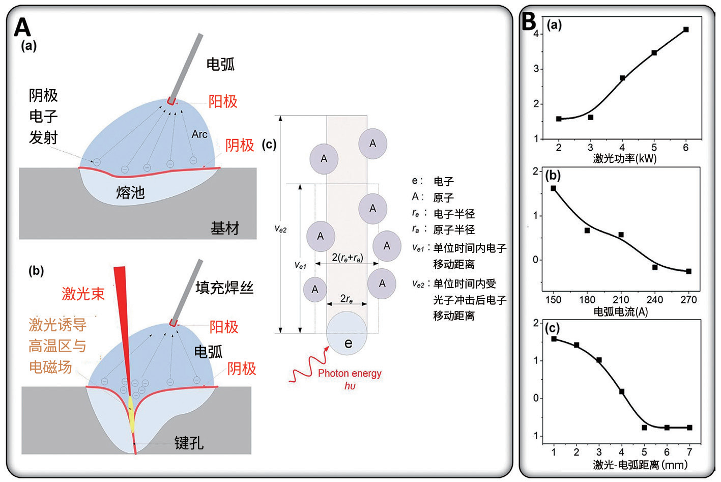图4:(A)热源协同效应示意图:(a)单电弧作用,(b)激光在激光-电弧复合焊中的作用,(c)激光对LAHW中电弧内部的影响;(B)不同焊接参数下热源协同效应的变化:(a)激光功率,(b)电弧电流,(c)激光-电弧间距