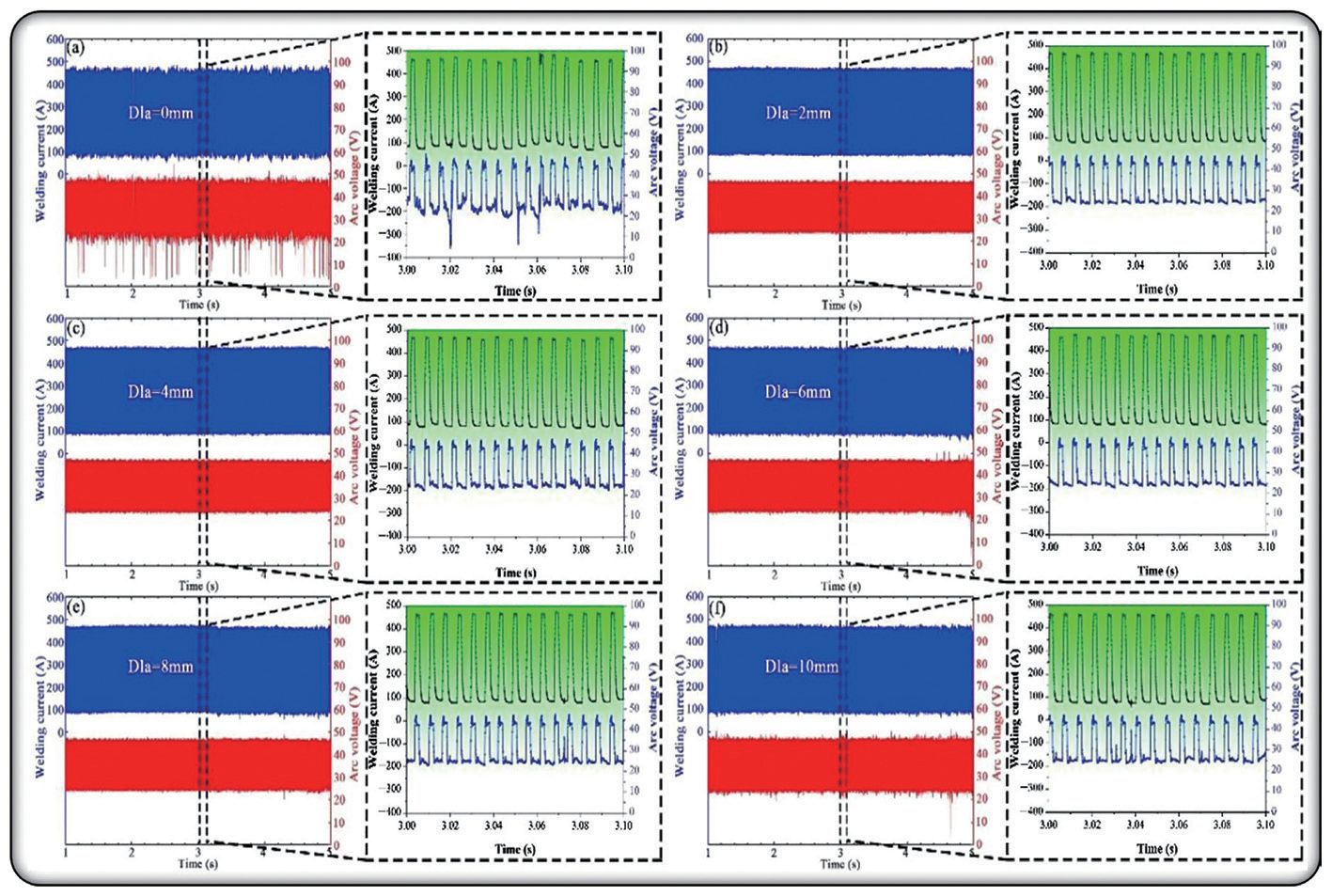 图5:不同激光-电弧间距(DLA)条件下激光引导电弧模式的电压与电流波形如图(a-f)所示,其中蓝色波形代表焊接电流,红色波形代表焊接电压;当DLA过小(a)或过大(f)时,波形均呈现不稳定特征