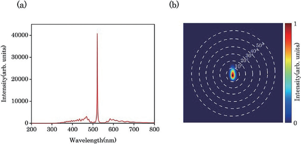图2:(a)520nm氮化镓基激光器发射光谱;(b)归一化远场分布模式