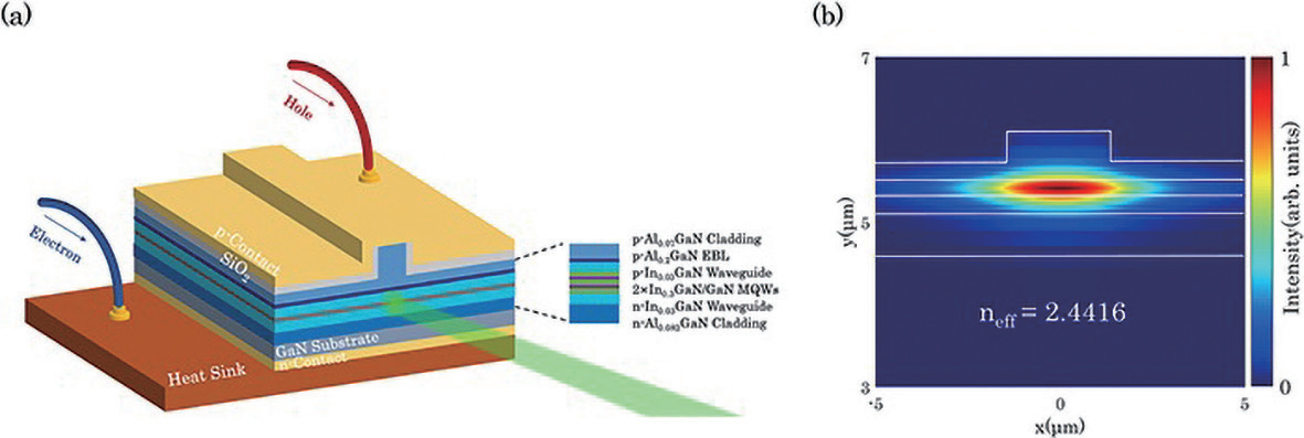 图1:(a)520nm氮化镓激光器三维结构示意图;(b)激光波导中的模式分布与有效模式折射率
