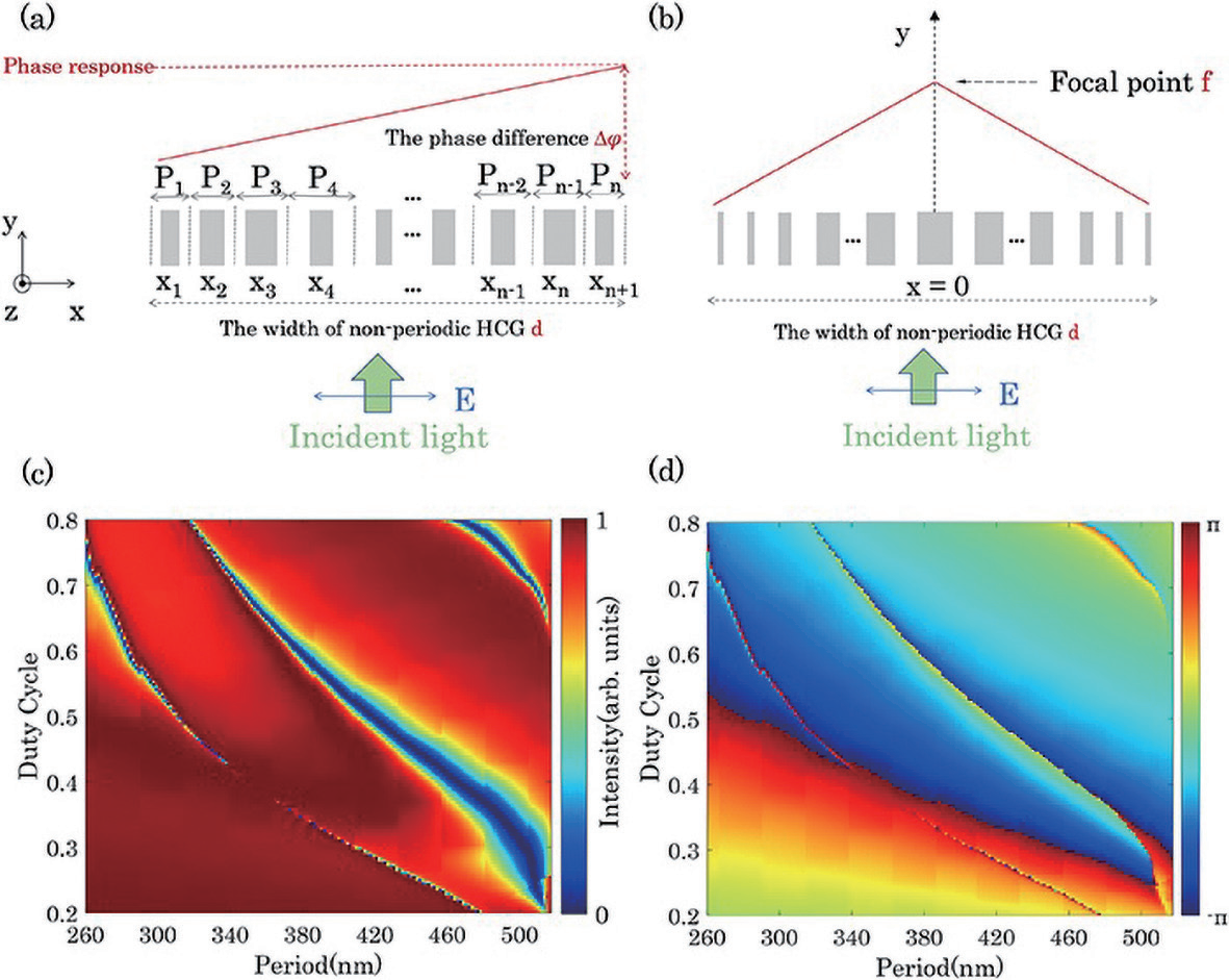 图3:(a)非周期性光束偏转亚波长光栅结构示意图;(b)非周期性聚焦亚波长光栅结构示意图;(c)光栅不同周期与占空比对应的透射率;(d)光栅不同周期与占空比对应的透射相位