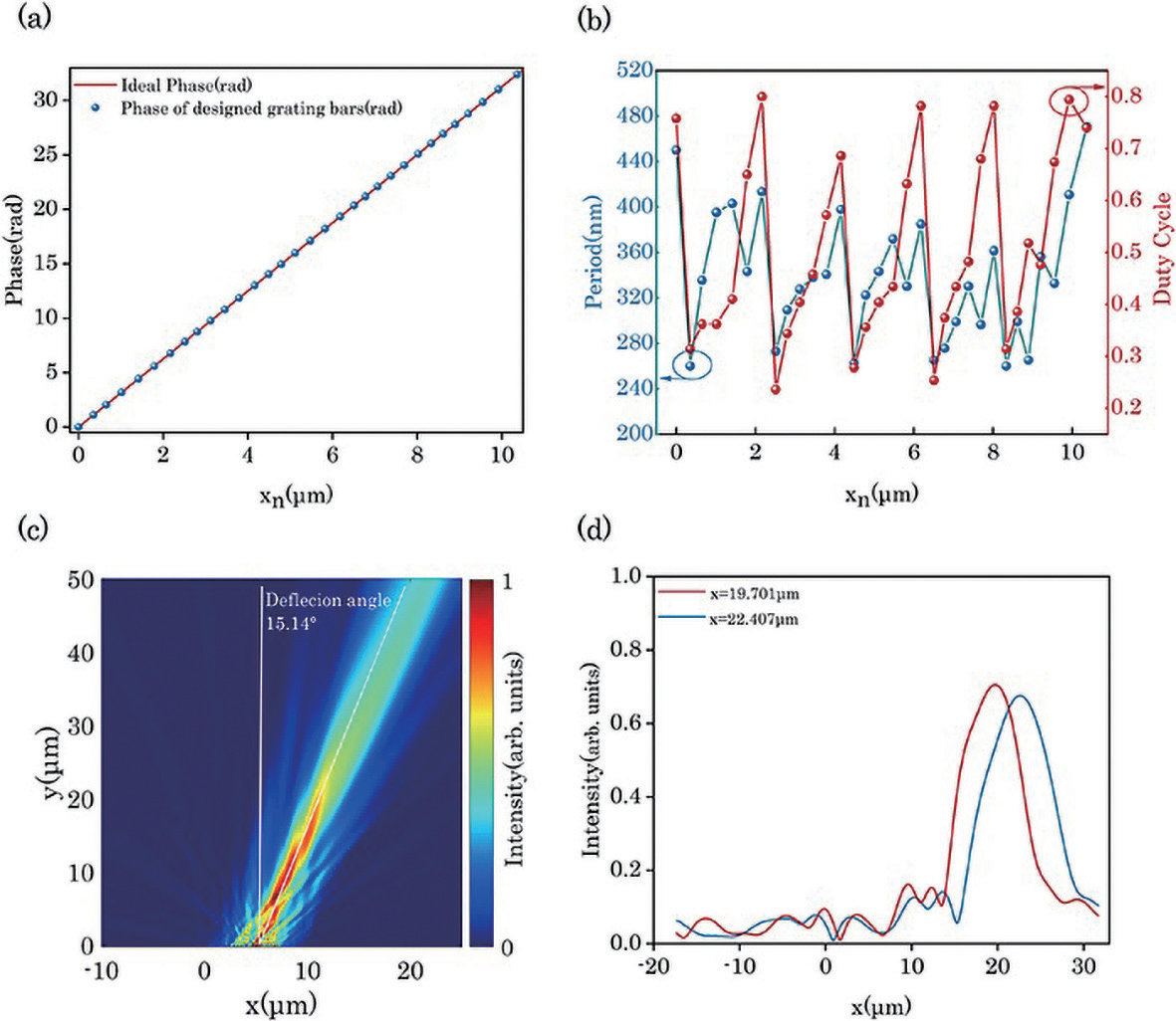 在光栅高度固定为500nm的条件下,团队分析了光栅周期260-520nm、占空比(定义为单光栅条宽度与周期的比值)0.2-0.8范围内对应的透射率与相位分布,如图3(c)和3(d)所示。结果表明在这些参数范围内可实现完整的2π相位覆盖和0-1的透射率调制,证实了设计线性相位梯度的可行性。基于参数仿真数据,我们选取具有渐进式2π相位调制的高透射率光栅单元,设计出能实现15°光束偏转的非周期性高对比度光栅。