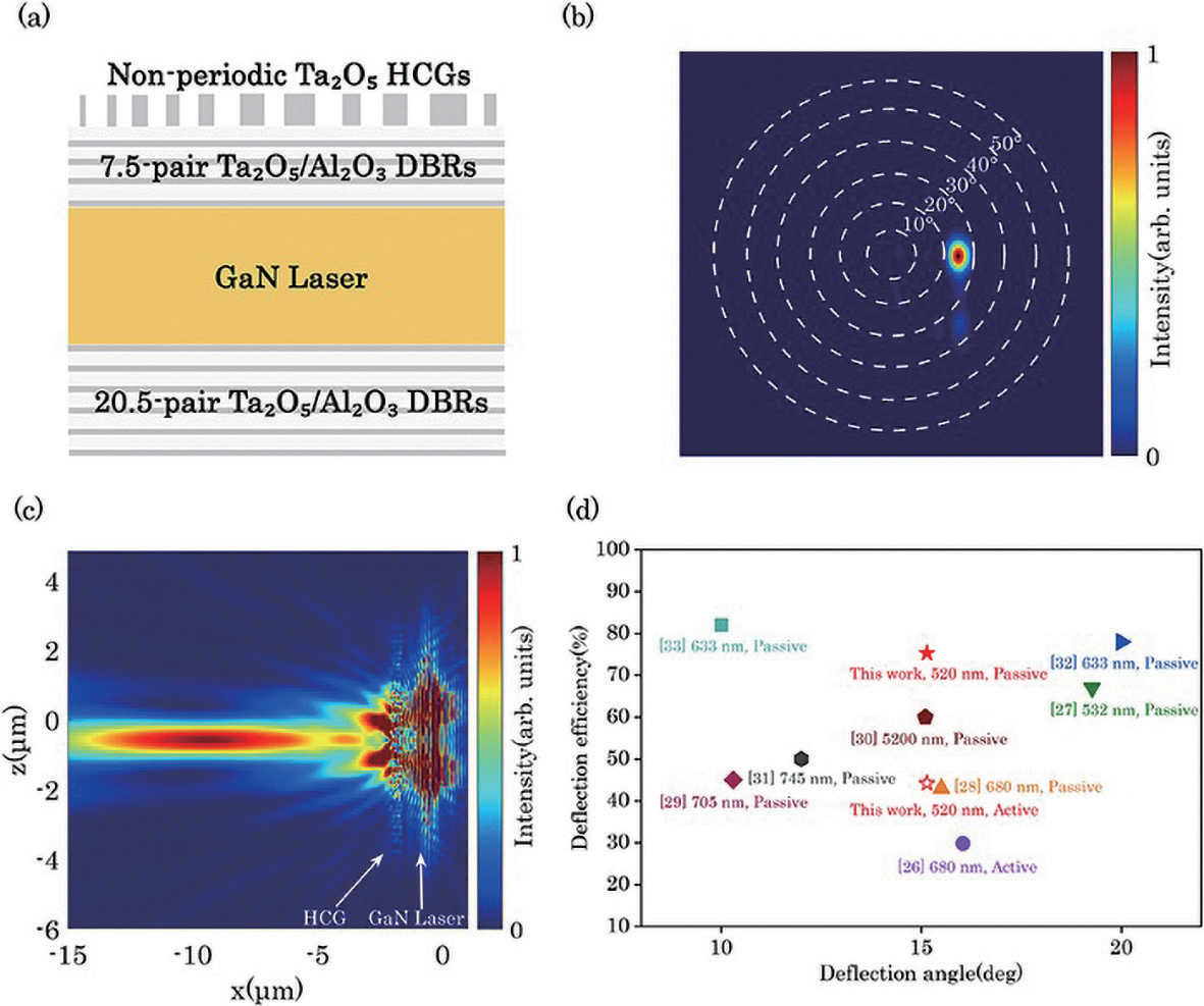 图5:(a)集成非周期亚波长光栅的氮化镓基激光器俯视图;(b)偏转角为15.14°的归一化远场分布图;(c)焦距f=8.2μm处的归一化电场强度分布;(d)被动型与主动型超表面偏转效率对比(与其他研究工作对比)