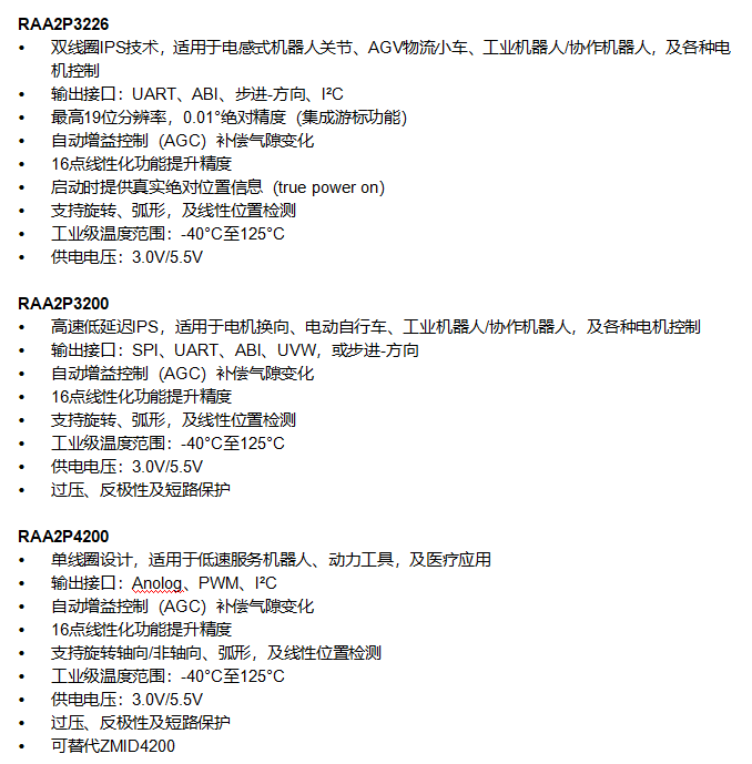 三款产品均具备高精度位置检测能力,精度优于电周期的0.1%。其中RAA2P3226和RAA2P3200最高可支持600K RPM(电气转速),传播延迟低于100纳秒,这对高速电机应用至关重要。高端型号RAA2P3226支持双线圈(2路位置信息),具备19位分辨率和>0.01°绝对精度,满足工业电机/机器人应用的高精度需求。RAA2P4200专为医疗设备、动力工具等低速应用设计;RAA2P3200则针对高速电机换向应用设计。三款产品均内置自动校准与线性化功能,可简化系统并提升系统级性能。