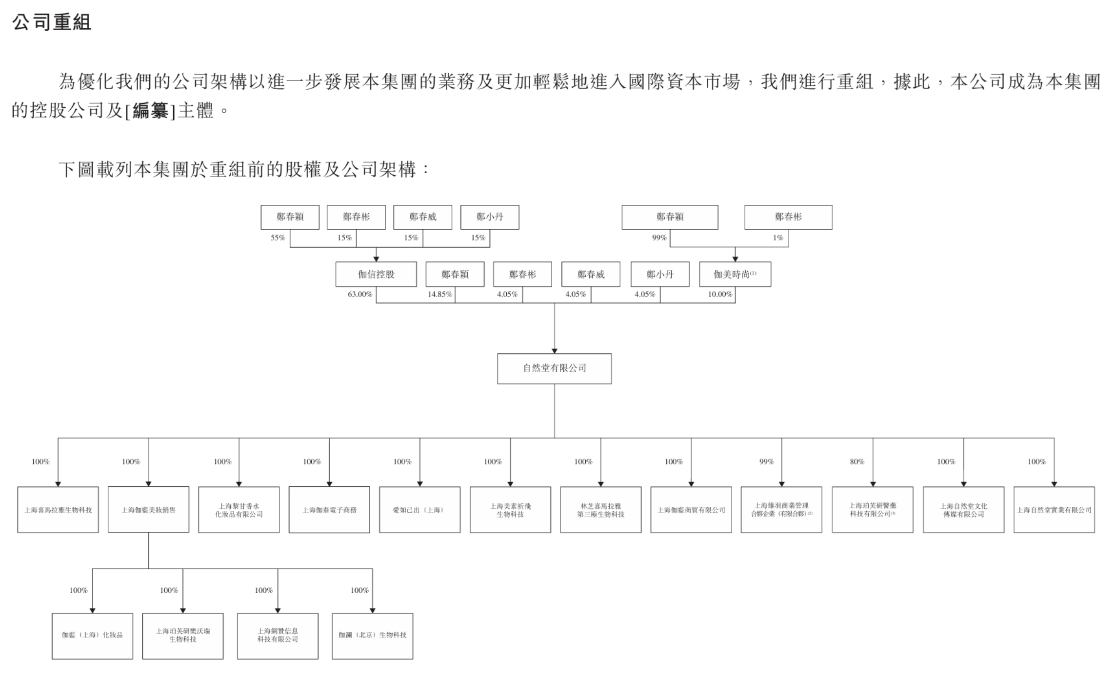 自然堂由创始人郑春颖于 2001 年创立,此前一直保持家族企业的股权结构。截至上市前,董事长兼首席执行官郑春颖及其家族成员郑春彬、郑春威、郑小丹合计控制公司约 87.82% 的投票权。