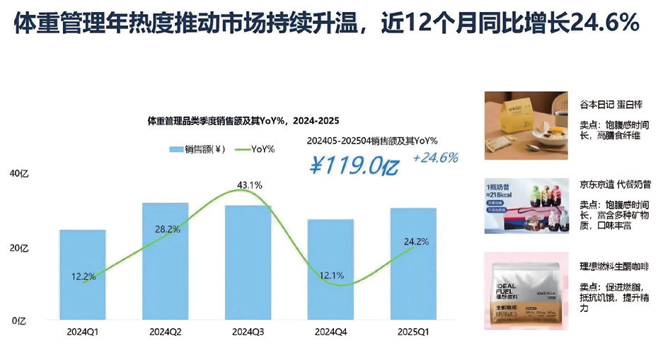 体重管理市场持续升温,过去12个月销售额达119亿元,同比增长24.6%,季度增速保持在12%以上,成为营养保健行业的“明星赛道”。产品形态上,蛋白棒、代餐奶昔、生酮咖啡成为三大主流品类,凭借“便捷性+功能性”获得消费者青睐。