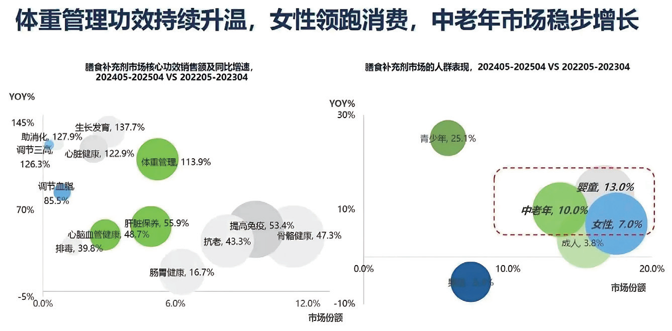 2024年5月至2025年4月,口服营养品市场呈现“整体稳健、渠道分化”的特征。传统电商平台(淘宝、天猫、京东)仍占据主导地位,但增速放缓;以抖音为代表的内容电商异军突起,销售额达到214亿元,同比增长38.4%。这一数据表明,新兴电商平台正成为营养保功效需求方面,细分赛道分化明显。体重管理成为最大黑马,同比增速达113.9%;调节三高(127.9%)、心脏健康(122.9%)、生长发育(137.7%)等功效紧随其后,反映出消费者对健康管理的需求从“基础免疫”向“细分场景”延伸。