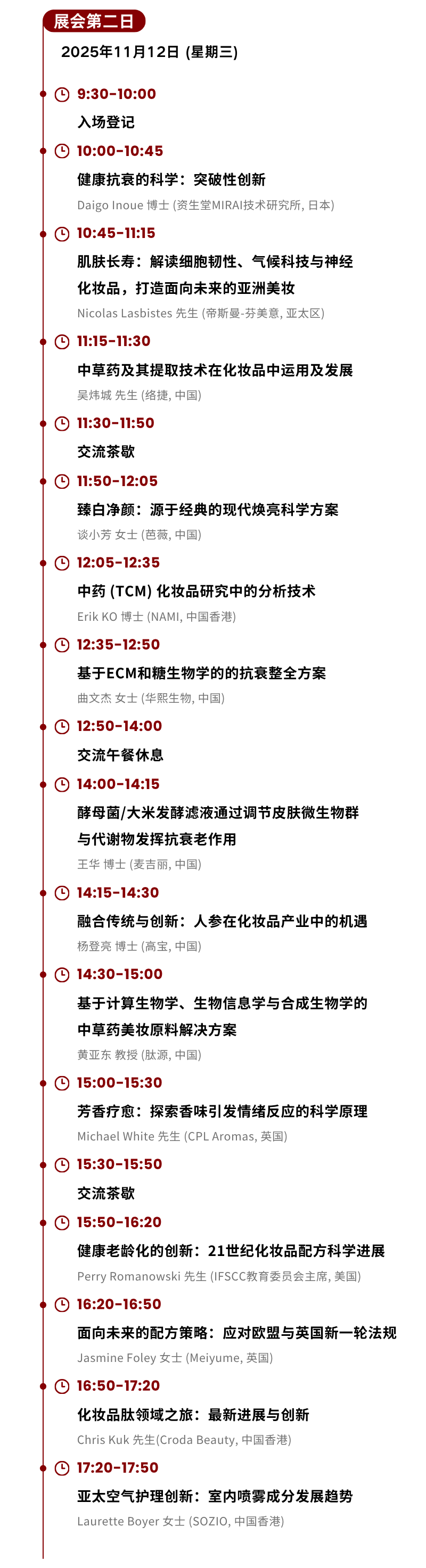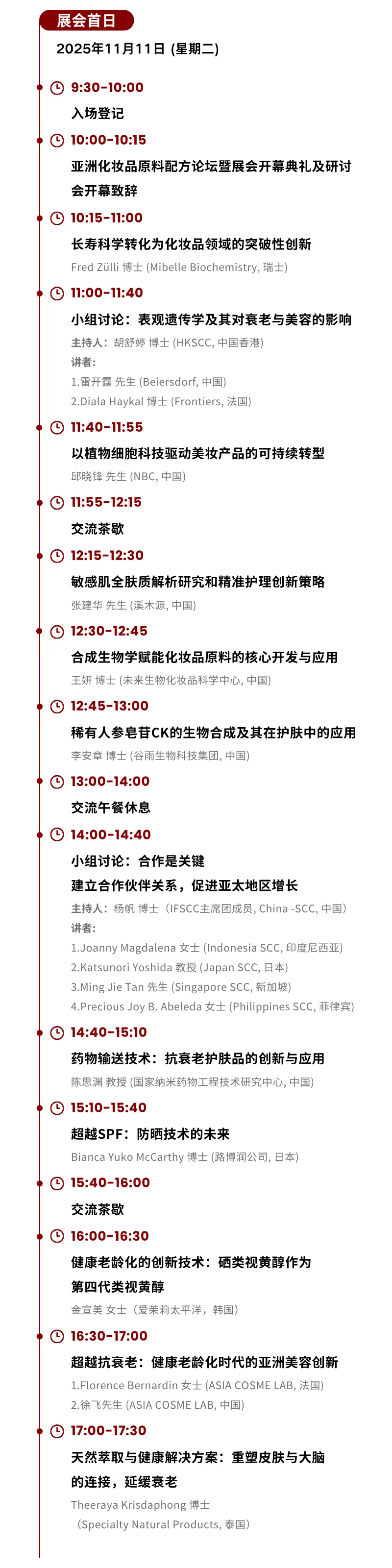两天高品质研讨会完整议程涵盖 10 余场精彩会议,包括主题演讲、小组讨论、化妆品科学论坛和案例研究。购票参与可获得研讨会手册及相关资料、同声传译服务、交流午餐和茶歇、展览厅参观机会,并参加所有交流招待会、新产品展示及相关活动。