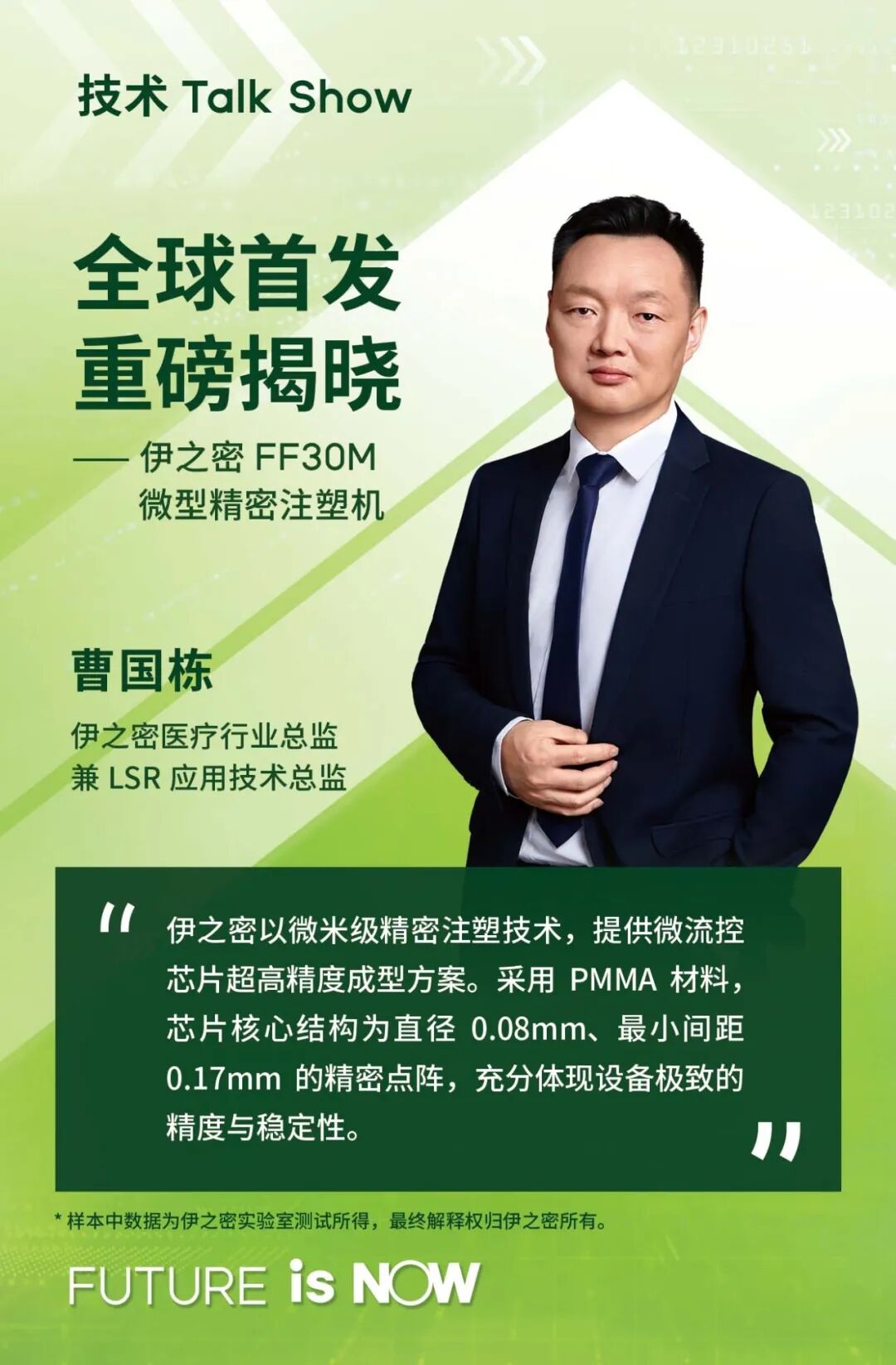 伊之密以微米级精密注塑技术,提供微流控芯片超高精度成型方案。采用PMMA材料,芯片核心结构为直径0.08mm、最小间距0.17mm的精密点阵,充分体现设备极致的精度与稳定性。