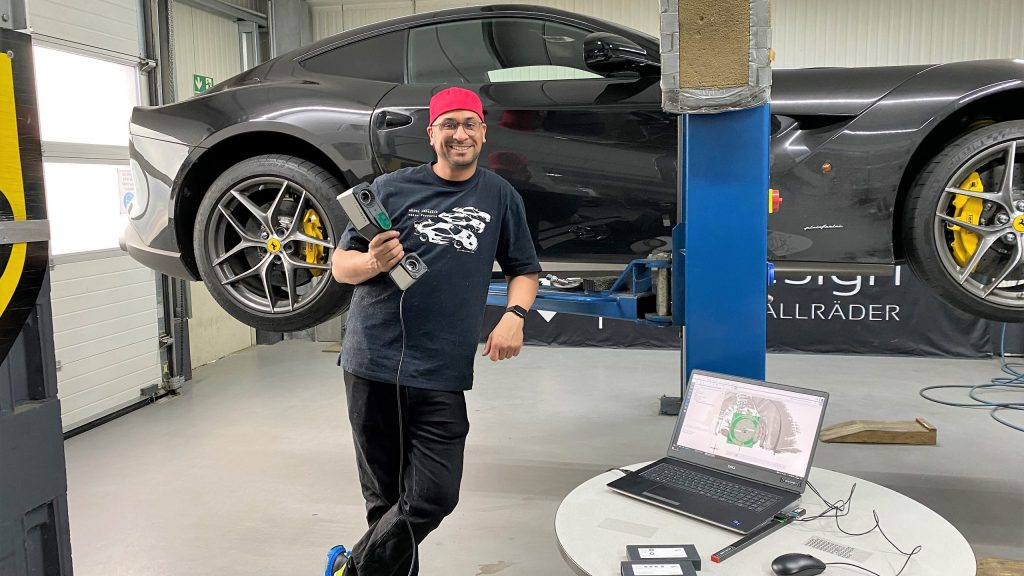 此次,我们陪同 Jean Pierre 拜访 mbDesign,核心目标便是基于 JP 的设计理念,为法拉利 F12 Berlinetta 优化轮辋:既要通过多样化设计方案强化车辆的运动美感,更要确保轮辋与车身的精准适配,让车辆外观与效能达到最佳平衡。而实现这一目标的关键,正是蔡司 ZEISS T-SCAN hawk 2 3D 扫描仪。