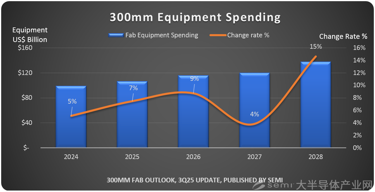 预计2025年全球300mm晶圆厂设备支出将首次超过1,000亿美元,增长7%,达到1,070亿美元。报告预测,2026年投资将增长9%,达到1,160亿美元;2027年增长4%,达到1,200亿美元;2028年将增长15%,达到1,380亿美元。