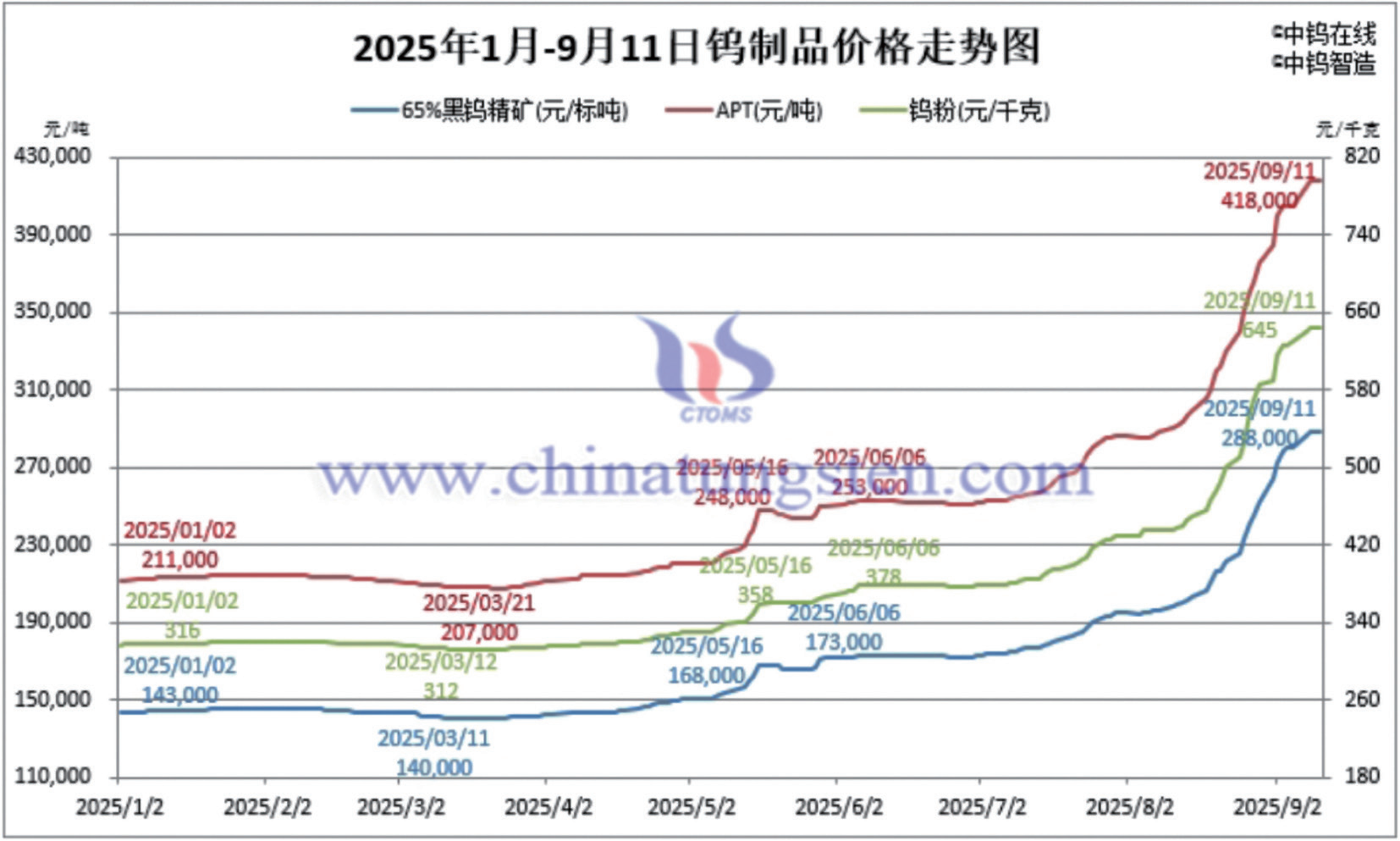 2025年的金属市场,钨成为最耀眼的“硬核明星”。从年初的15万元/吨到9月突破28万元/吨,钨精矿价格年内涨幅超100%,仲钨酸铵(APT)更飙升至41万元/吨,创下历史新高。