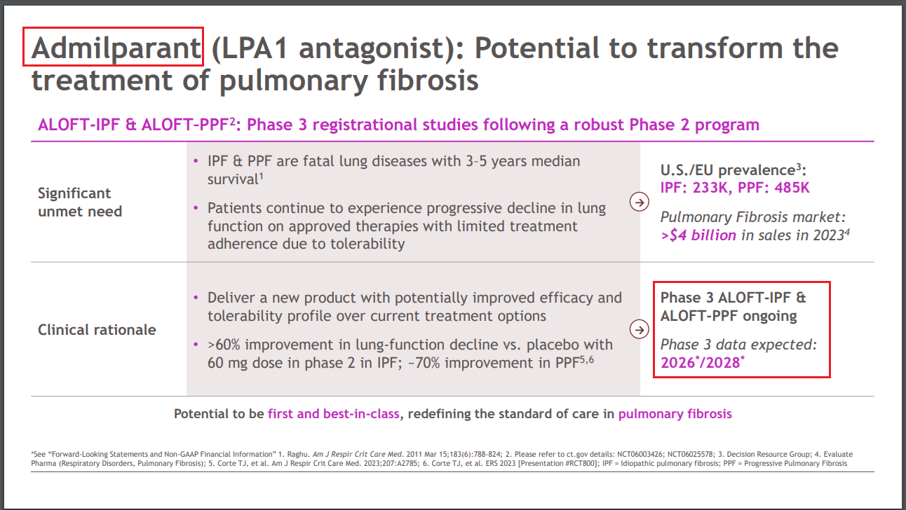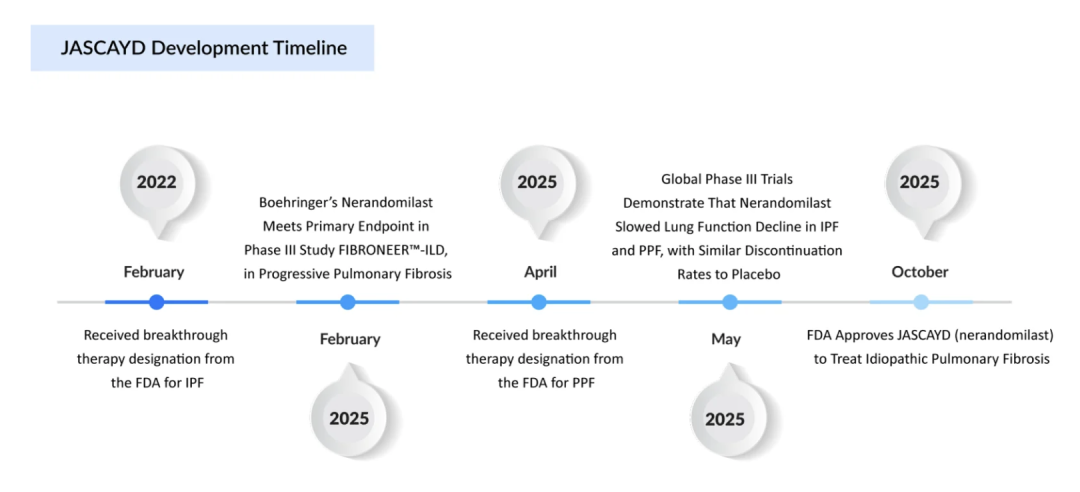 nerandomilast 特此前已获得 FDA 授予的突破性疗法认定和优先审评资格,适应症包括 IPF 和进行性肺纤维化(PPF)。该药物目前也在欧盟、中国和日本接受监管审评,其他地区的申报工作将陆续展开。此外,nerandomilast 还在系统性硬化症的 II 期临床试验中进行评估。