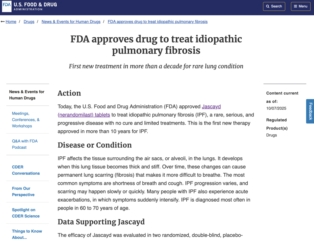 美国食品药品监督管理局(FDA)于 10 月 7 日批准了勃林格殷格翰的 Jascayd(nerandomilast)用于治疗特发性肺纤维化(IPF)成人患者。这是 IPF 领域十年来获批的首个新药,打破了自 2014 年以来的沉寂。