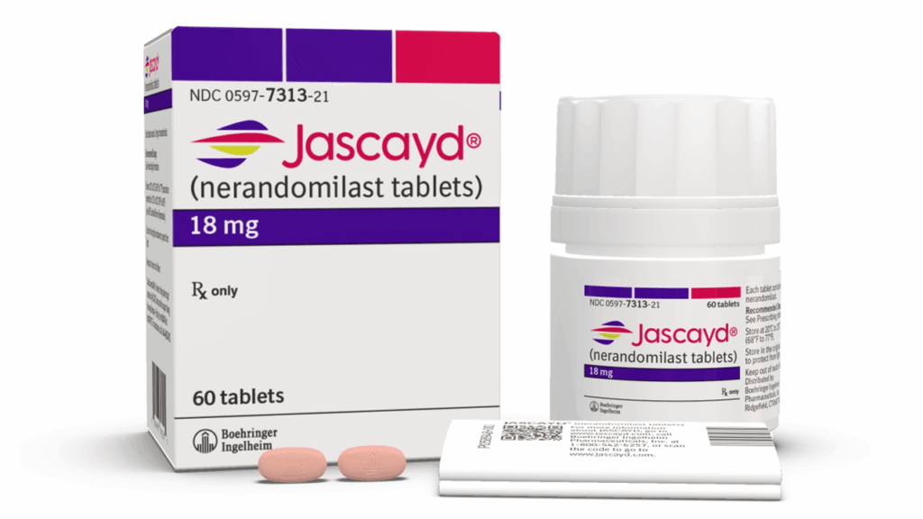 Jascayd 是首个也是唯一一个获批用于该适应症的磷酸二酯酶 4B(PDE4B)选择性抑制剂。PDE4B 是一种在肺部大量存在的酶,在炎症和瘢痕组织形成中发挥关键作用。通过抑制这种酶,nerandomilast 特发挥抗纤维化和免疫调节双重作用,从而减缓 IPF 患者的肺功能下降。这代表了一种新的作用机制。
