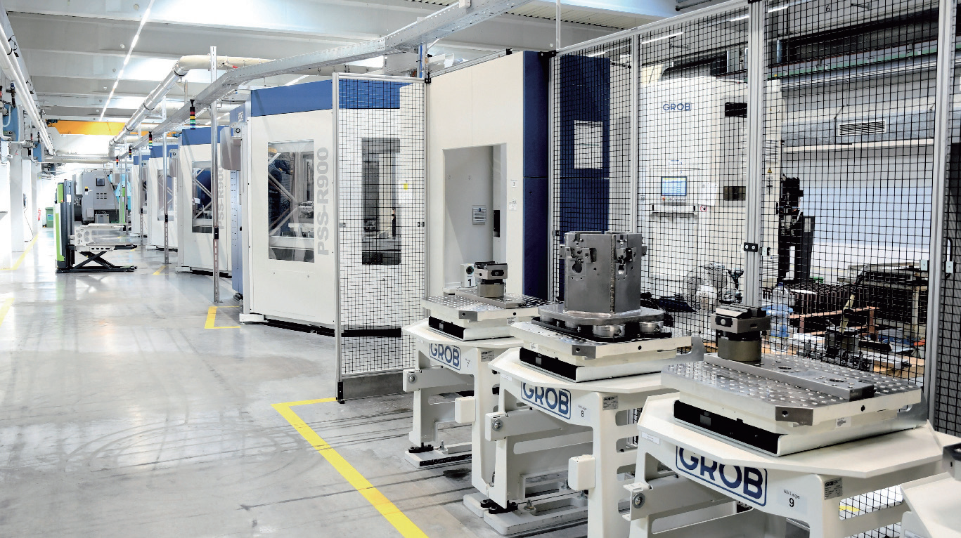 基于这种方法,最终形成了一个由10台格劳博的五轴加工中心G550、一个用于工件和刀具搬运的无人驾驶运输系统Agilox以及一系列Gressel的夹持系统组成的方案。