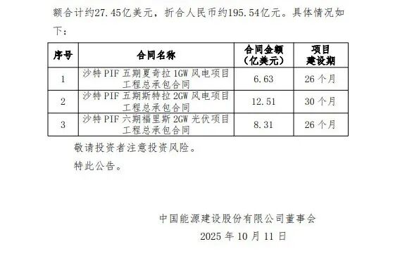 近日,公司所属子公司中能建国际建设集团有限公司、中国能源建设集团广东火电工程有限公司、中国电力工程顾问集团西北电力设计院有限公司组建的联营体,与沙特国际电力和水务公司、沙特公共投资基金、沙特阿美电力公司成立的项目公司,签署了3份新能源总承包工程合同,合同金额合计约27.45亿美元,折合人民币约195.54亿元。