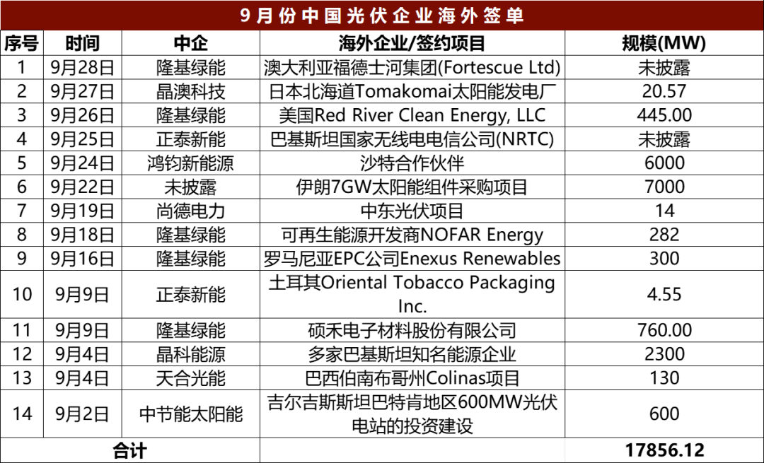 据不完全统计,9月至今,各大企业已经签署近25GW海外大单!