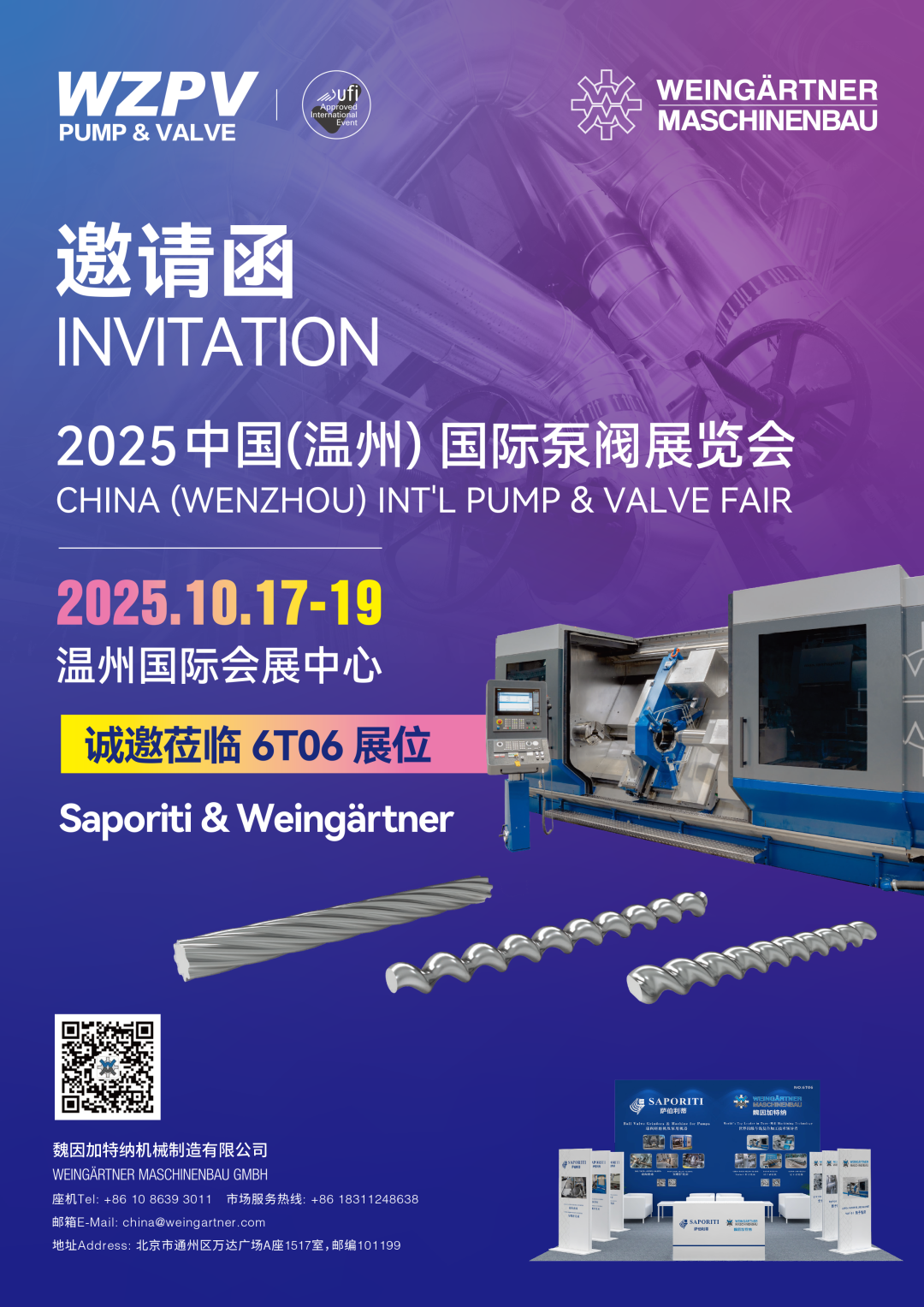 携手魏因加特纳与Saporiti,让我们在温州共同开启泵阀制造的精密度与高效率新纪元!金秋十月,我们期待与您相见!不见不散!