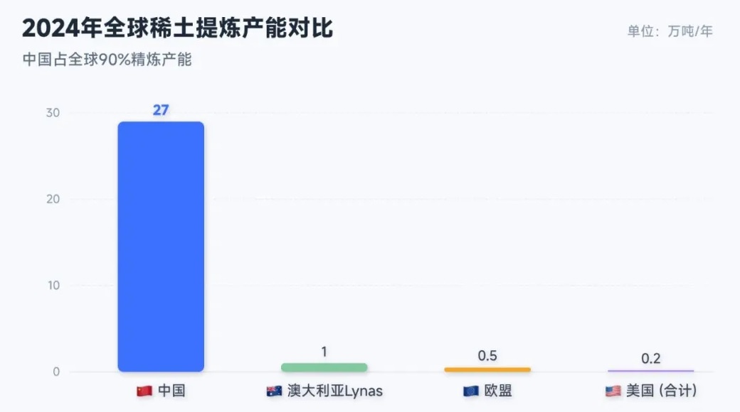 有关稀土的话题其实还有很多其他,其中,关于稀土的提纯也是非常重要的环节。目前,中国控制着90%的全球精炼产能,而美国、日本、欧盟、澳大利亚这些经济体加起来,勉强凑出剩下的10%。