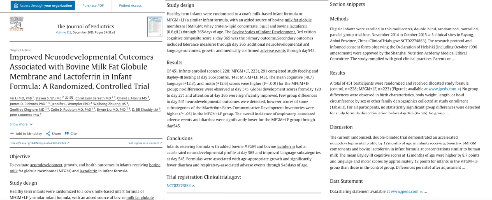 《婴儿配方奶粉中牛乳脂球膜和乳铁蛋白促进神经发育研究结果:随机对照试验》[5]