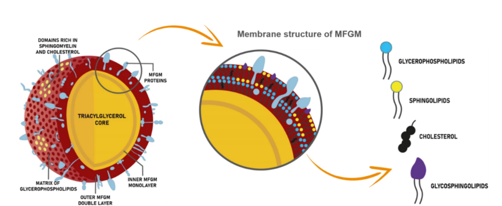 母乳中的脂肪以乳脂球的形式存在,可为婴儿提供约50%的能量。乳脂球膜就是包裹在脂肪球外层的三层磷脂结构,可保护乳脂球免受酶分解、氧化或聚集。