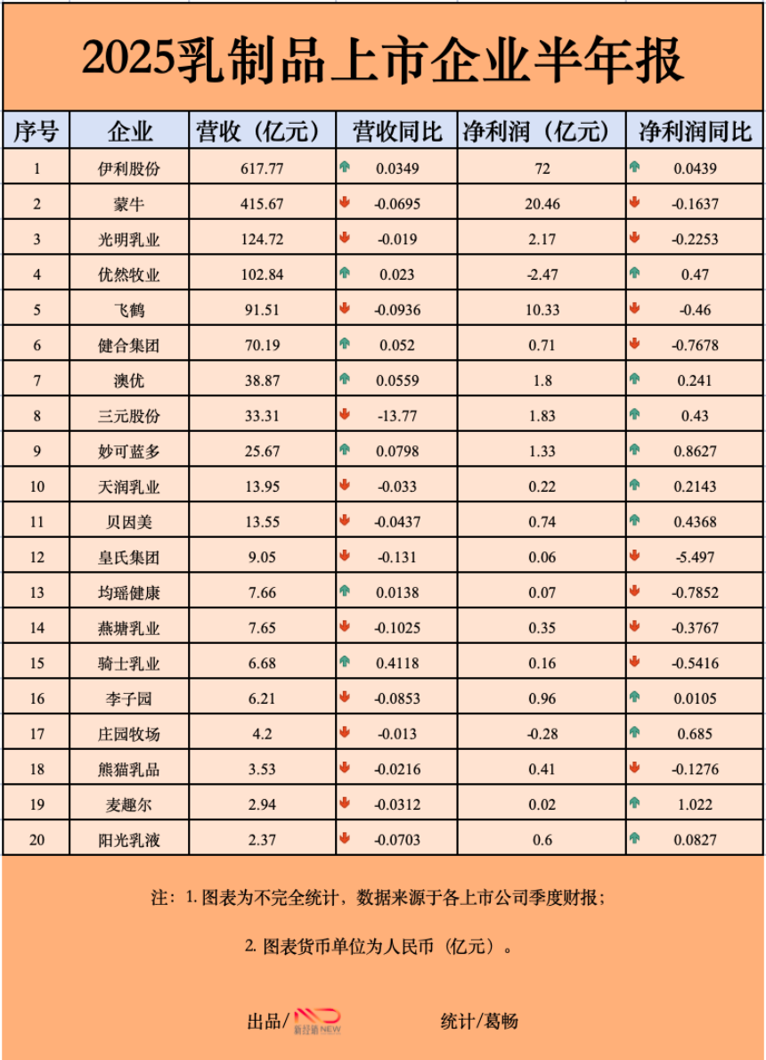 在我们整理的20家乳制品上市企业半年报中,11家实现营收同比增长,9家出现下滑。其中,头部乳企凭借全产业链优势率先实现价值转化,中小乳企则在细分领域继续寻找差异化机会。