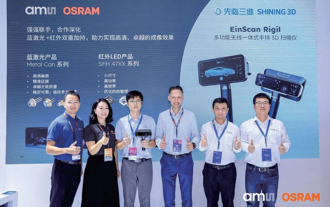 此次展会,艾迈斯欧司朗合作伙伴——先临三维发布了新品EinScan Rigil多功能无线一体式手持3D扫描仪,该设备搭载了艾迈斯欧司朗先进的Metal Can系列蓝激光和SFH 47xx系列红外LED,凭借双光源的卓越性能,显著提升环境光抗干扰能力。