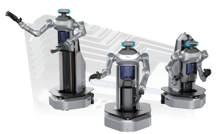仙工智能带来多款不同类型的适合仓储物流搬运的轮式人形机器人。他们搭载有 SRC-5000人形机器人一体化控制器,配备实时操作系统与时间敏感网络,支持高精度同步及EtherCAT主站通信、时钟抖动低于30μs,“手、眼、足”高度一体化协同。其还配备3D识别相机,能准确定位目标物体的位置和姿态,获取三维结构信息,实现精准抓取。产品高达40+自由度,动作依然流畅自如,并且采用轮式全向底盘,具备大负载与卓越稳定性,缓存台设计可满足货物缓存搬运。