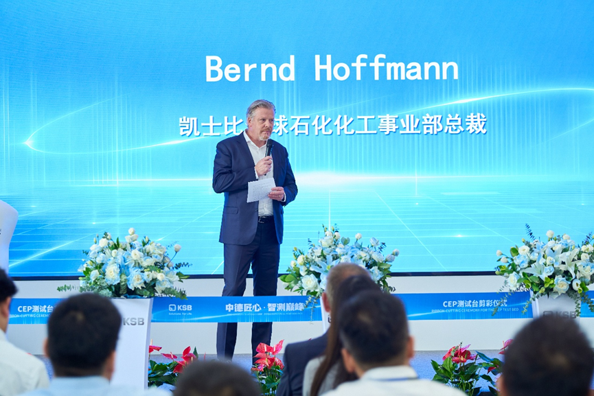 Stephan Bross博士在剪彩仪式上用了三个词清晰概括了上海凯士比31年以来的发展:“中国速度、德国品质、光明未来”,并表示,中国已成为凯士比全球第二大市场!他高度肯定了CEP测试台对于凯士比中国未来快速发展的意义,并赞叹这一杰作融合了中德团队的智慧,“CEP测试台借助了KSB集团提供的软件来精确读取相关数据,以保证测试的质量。同时,整个测试台的操作界面由KSB上海团队自行开发设计的,这就可以保证对当地客户的使用友好。”