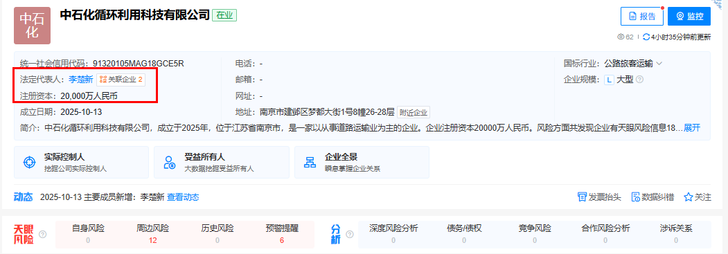 10月13日,天眼查App显示,中石化循环利用科技有限公司完成工商注册登记,正式宣告成立。注册资本高达2亿人民币,由中国石化化工销售有限公司全资持股。这一举措标志着中国石化在循环经济产业布局上迈出了实质性的关键一步。