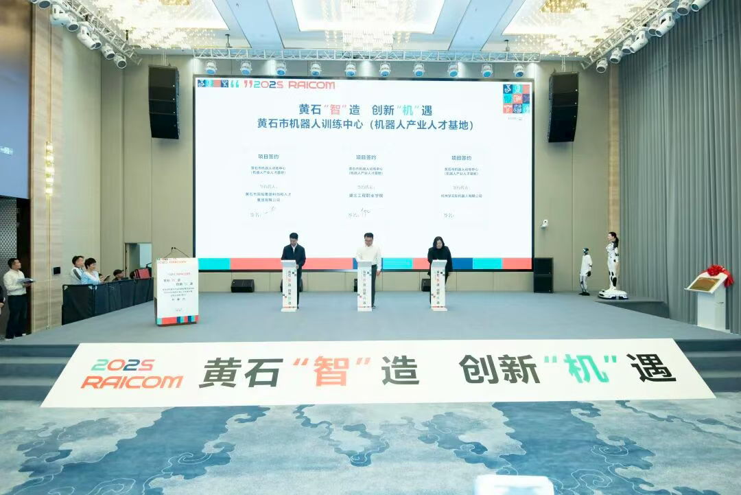 10月18日,黄石市机器人产业创新发展交流会暨2025年睿抗机器人开发者大赛全国总决赛开幕式现场,黄石机器人智能制造产业园正式揭牌,黄石市机器人训练中心(机器人产业人才基地)签约成立。
