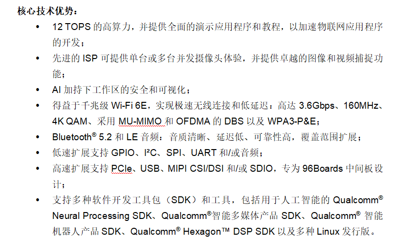 此外,在软件方面,该平台支持Qualcomm® Linux®——一个专为高通物联网平台设计的集成式操作系统,包含完整的软件堆栈、开发工具及文档,能够帮助开发者高效构建AI应用。