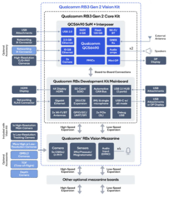 Qualcomm RB3 Gen 2开发套件采用模块化设计,遵循96Boards紧凑型信用卡尺寸规格,支持基于Vision Mezzanine的一系列夹层板扩展,兼具小巧外形与高度扩展性。另外,该套件提供丰富的连接选项,包括多个USB接口、以太网口、摄像头和显示端口,并支持各类GPIO,可同时满足低速通信协议与高速连接的需求。