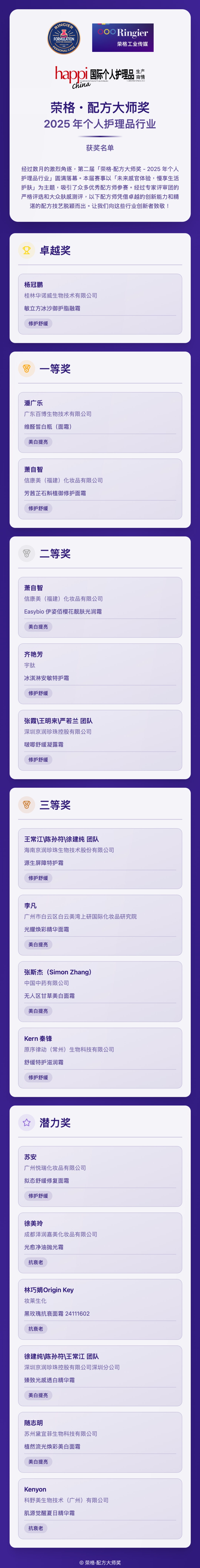 经过数月的激烈角逐,第二届「荣格·配方大师奖 - 2025 年个人护理品行业」圆满落幕!
