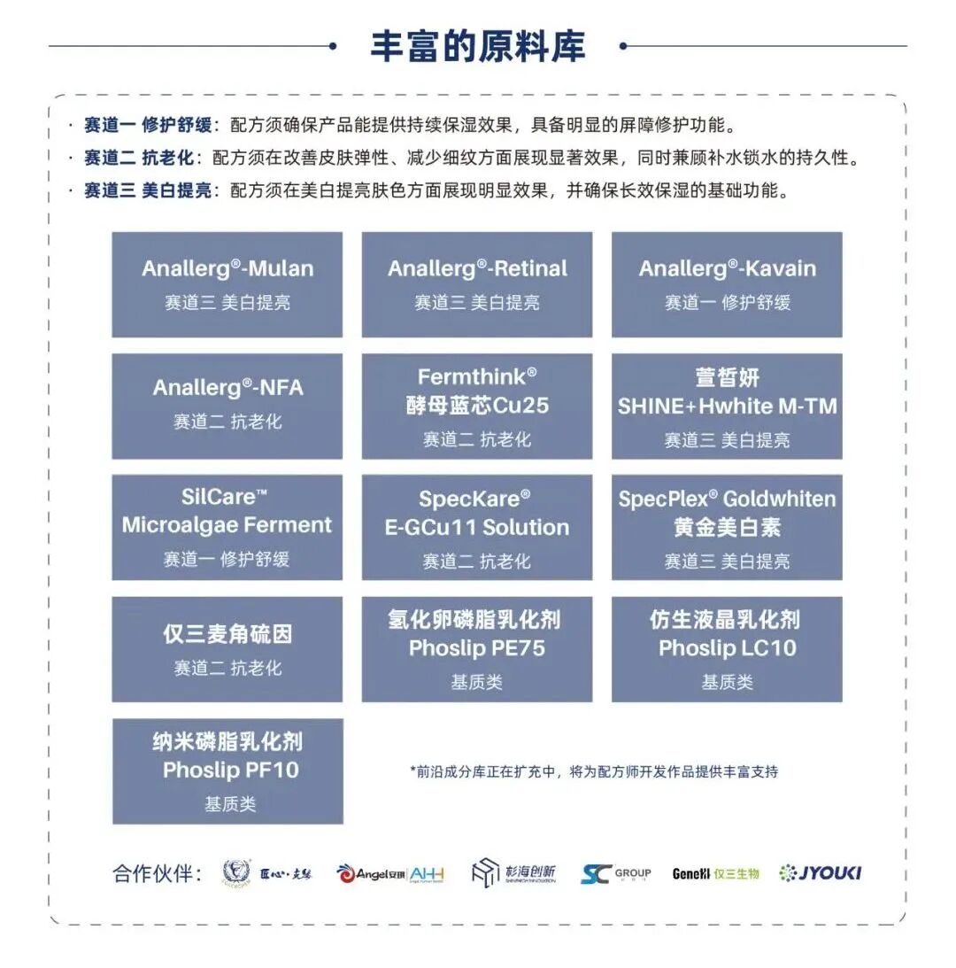 2025 年,今年的第二届赛事在原料支持上也实现质的飞跃。五家行业领先的原料供应商携手参与,提供了十款前沿优质原料,不仅覆盖修护舒缓、抗老化、美白提亮三大功效赛道,更引入了满足肤感优化需求的前沿基质原料和创新乳化剂。克琴实验室带来 Anallerg-Kavain(卡瓦胡椒提取物)、Anallerg-Retinal(视黄醛)、Anallerg-Mulan(四氢木兰醇)、Anallerg-NFA(麦芽糖酸)等多款明星原料;斯拜科贡献了 SilCare Microalgae Ferment(微拟球藻发酵提取物)、SpecPlex Goldwhiten(黄金美白素)SpecKare E-GCu11 Solution 等功效与肤感兼顾的解决方案;杉海创新提供萱晳妍 SHINE+Hwhite M-TM 美白原料;仅三生物的 GeneIII 麦角硫因、安琪的 Fermthink 酵母蓝芯 Cu25、金久奇的 Phoslip 系列磷脂乳化剂(PE75、LC10、PF10),为配方师提供了从功效到质地的全方位创新可能。