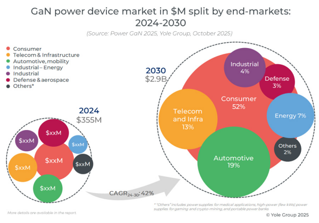 2025 年标志着人工智能发展的大幅加速,数据中心和电信基础设施对高效电源的需求不断增长。NVIDIA 与德州仪器 (TI) 、纳微 (Navitas)、英飞凌 (Infineon) 等公司的合作正在推动 800V 高压直流系统采用氮化镓,预计到 2030 年,数据中心和电信将占市场的 13%。