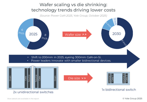 然而,挑战依然存在。EPC、英飞凌和 Innoscience 之间持续不断的知识产权纠纷可能会减缓采用速度。尽管台积电退出,但代工厂继续发挥着至关重要的作用,X-Fab、GlobalFoundries 以及 PSMC 和 Polar Semi 等新进入者都在扩大产能。epihouse(例如 IQE 和 X-fab)和 IDM 之间的合作伙伴关系增强了供应弹性。功率氮化镓格局正在演变为由整合、IDM 主导的模式以及战略代工厂-epihouse 联盟塑造的格局。
