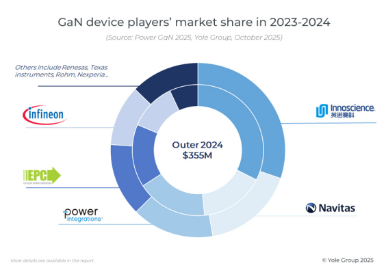 自 2023 年以来,在英飞凌 830M 美元收购 GaN Systems 和瑞萨电子 339M 美元收购 Transphorm 等重大并购的推动下,功率氮化镓行业进入整合阶段。在过去的几年里,投资超过 $1.25B,像 Wise Integration 这样的初创企业筹集了 $16.4M,凸显了强劲的市场势头。其他参与者正在加大力度:意法半导体正在建设 8 英寸 GaN 晶圆厂,Nexperia 正在扩展其 e-mode 平台,ROHM 推出了 EcoGaN 器件。与此同时,三星正在准备在 2026 年发布 GaN。至于安森美,虽然该公司一直保持沉默,但其 2024 年 GaN 技术论文以及在 Si 和 SiC 领域的强势定位使其进入 GaN 领域不可避免。