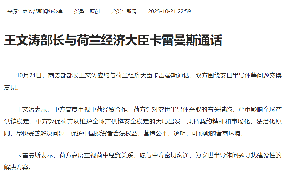 另外,10月21日晚间,商务部官网消息,商务部部长王文涛应约与荷兰经济大臣卡雷曼斯通话,双方围绕安世半导体等问题交换意见。