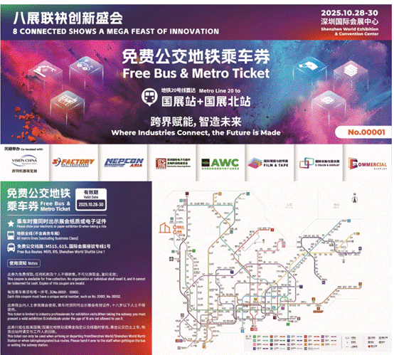 主办方在开展期间特别为前来展会的参展商和观众提供免费公交地铁乘车券,凭您的“2025亚洲工业科技展 ”任一展会的展商证或参观证领取,每人每天限领2张,当日领完为止。