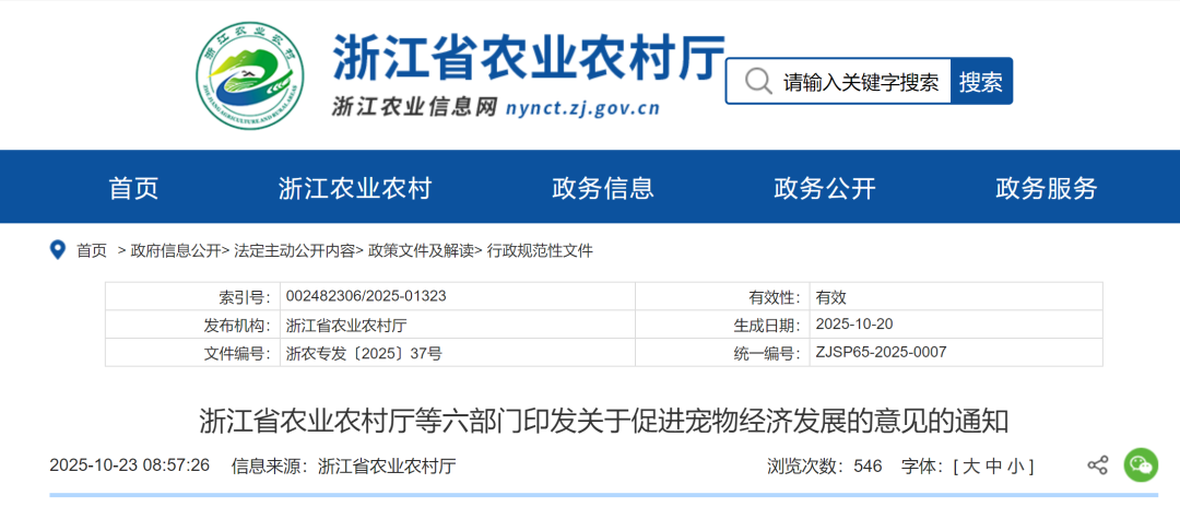 10月23日,浙江省农业农村厅、浙江省发展和改革委员会、浙江省商务厅、浙江省文化广电和旅游厅、浙江省市场监督管理局、浙江省林业局等六部门联合印发《关于促进宠物经济发展的意见》。该文件指出,此举旨在进一步培育壮大宠物产业集群,激活宠物消费新动能,推动宠物行业规范、健康发展。